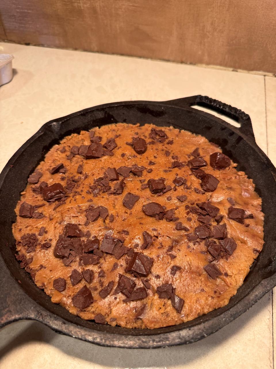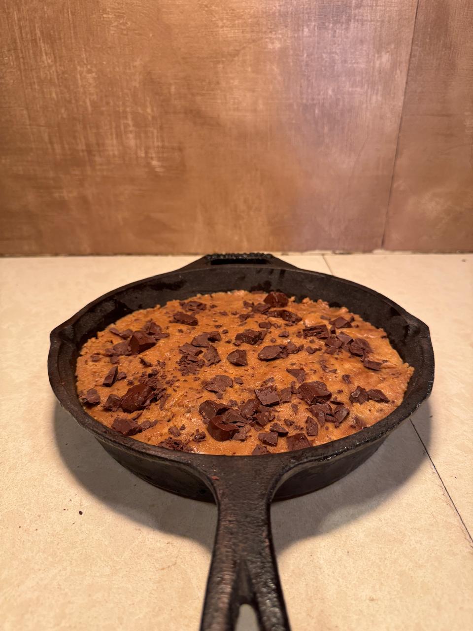 Mix in 200g chocolate chips or chunks. Reserve some for topping.Press into Skillet